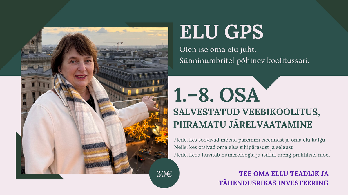 Elu GPS on kaheksaosalise salvestatud veebikoolituste sari, mis aitab sul avada oma isikliku elu suunaviidad – sünninumbreid kasutades. See on nagu isiklik elu GPS, mis aitab sul liikuda teadlikumalt ja harmoonilisemalt oma unistuste suunas.